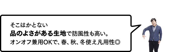 「先の秋冬シーズンから展開されているラインで、デニムのような綾織り生地のカットソーです。カットソー生地にさらにポリウレタンを混紡しているから、ほら、こんなに伸びちゃうんですよ。思わず引っ張りたくなります。タイトめなシルエットですが、これだけ伸縮性が高いのでストレスを感じさせません。濃色なので遠目からはフツーの紺ジャケに見え、お堅いオフィスでなければビジネス使いしてもとくに問題ないでしょう」
