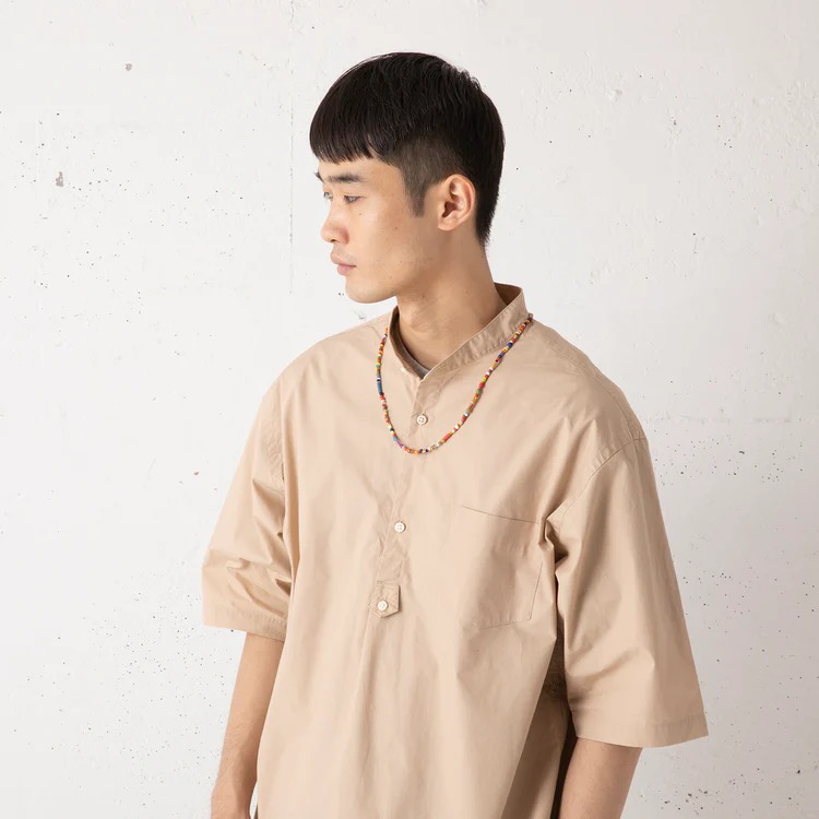 本体は贅沢に高品質な国産ビーズを使ったネックレスがベース。シャツだと、第二ボタンより少し下の位置くらいの長さです。ターコイズが良いアクセントになるので、Tシャツに合わせても粋ですよ〜。