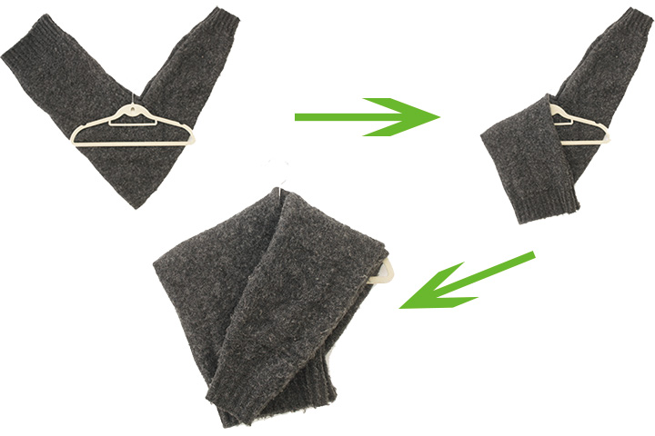 収納は掛ける派!という人はこの方法をマスターすべし。単にハンガーに掛けるだけだと腕の重みによって肩&袖が伸びがちだが、これなら重量が分散される。ハンガー1本で身を受ける畳みワザに、イッポントラレマシタ。
