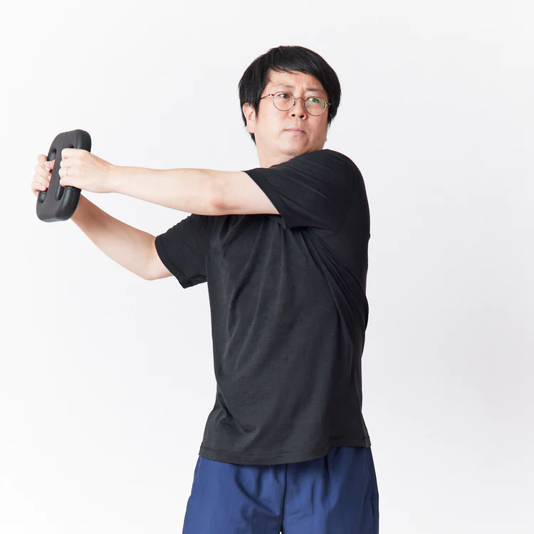 「エクリアスポーツ」のトレーニングウエイトです。片手と両手、それぞれの筋トレメニューを実施できるダブルハンドル仕様で、体幹・連動性・下半身を鍛えます。大きな遠心力が得られるハンドルポジションは回旋強化にも効果的です。