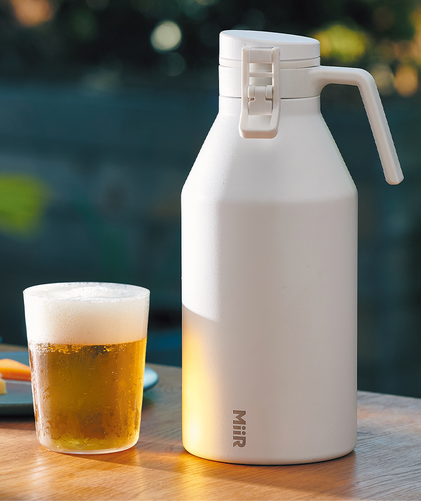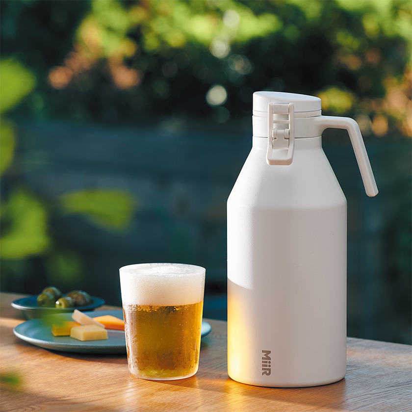 バックル付きの蓋でクイックに開閉できる、真空断熱構造を採用したグラウラー。環境に優しい手法で柔和な白に粉体塗装され、無垢の木や、作家ものの器にもマッチする佇まい。Φ121×H292mm。9350円(サンウエスト)