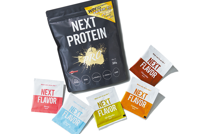 無味のプレーン味のプロテインをベースに、フレーバーを組み合わせる盲点アイデアなプロテイン。写真のPROは一食30g中タンパク質25g以上を含むホエイプロテインで、300g 3500円。全5種類のフレーバーには、筋肉の回復を助ける糖質成分「デキストリン」を配合。5g 各130円。