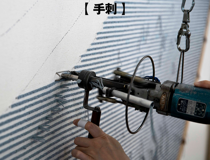 クラシックな手織緞通と同等の品質、工芸的な風合いを保ちながらコストと時間の短縮を目指して1965年に導入されたのが手刺緞通。