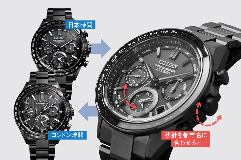 クロノグラフモデルは海外出張や海外とのやりとりが多いビジネスマンにとって大きな味方となる。そのワケはシチズンならではのダイレクトフライト機能。りゅうずを引っ張って、秒針を都市名に合わせる2ステップで、即座にその都市の日時を表示してくれるのだ。しかもクロノグラフモデルは、2つのタイムゾーンを同時に表示可能なデュアルタイム機能も備えた、ダブルダイレクトフライト機能を搭載。メインの時分針とインダイヤルにて表示されている、ホームタイムとローカルタイムを瞬時に切り替える、ダイレクトチェンジも搭載している。全世界のタイムゾーンのうち39時差をカバー。