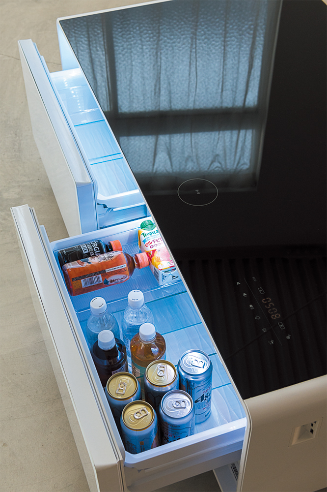 ドリンクが切れるたびに、会話を中断してキッチンまで取りにいくのが面倒すぎる……。だったらコレ! ただのテーブルじゃありません、側面に引き出し式の冷蔵庫を2室も搭載してるんです!