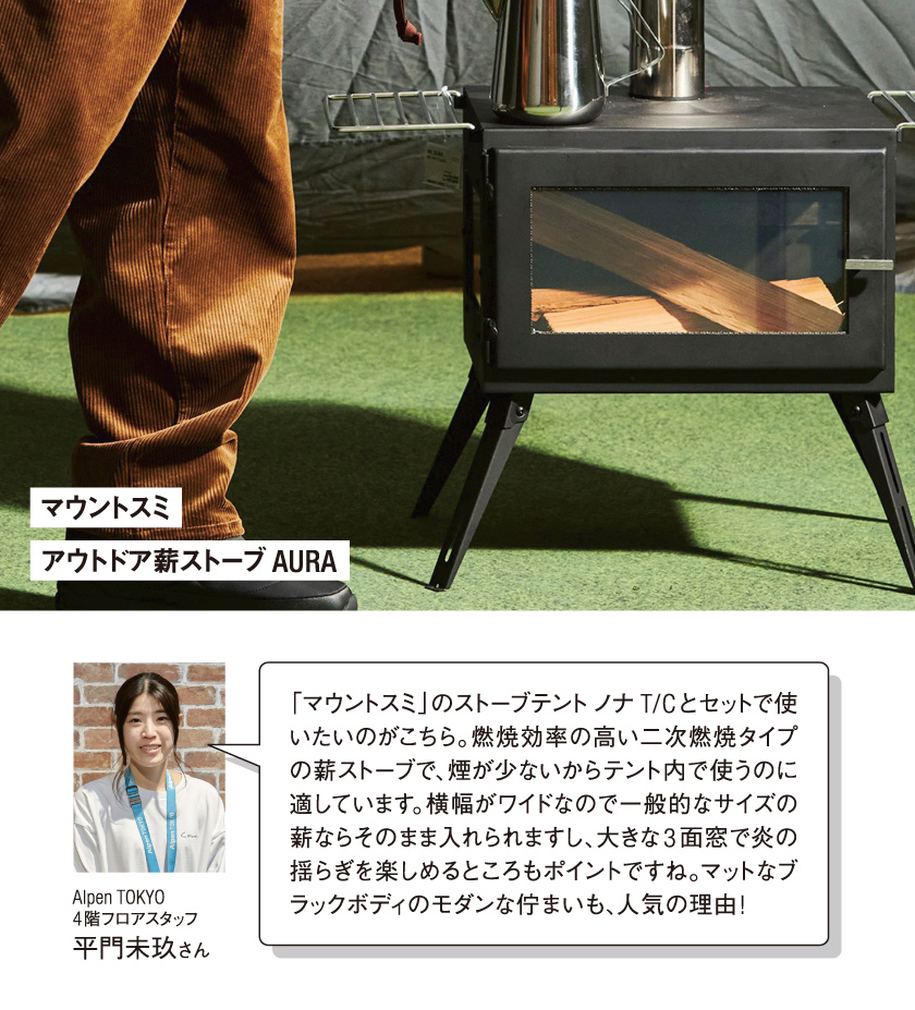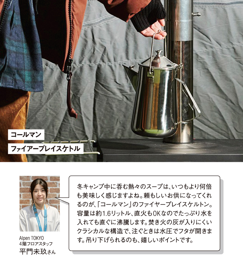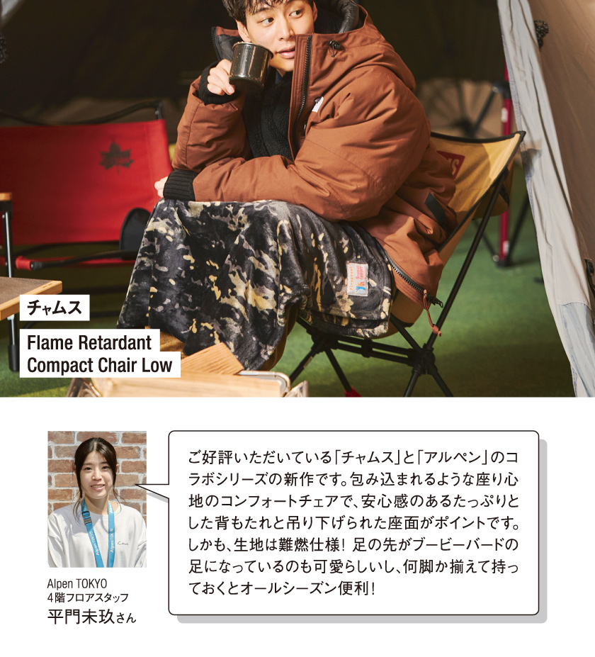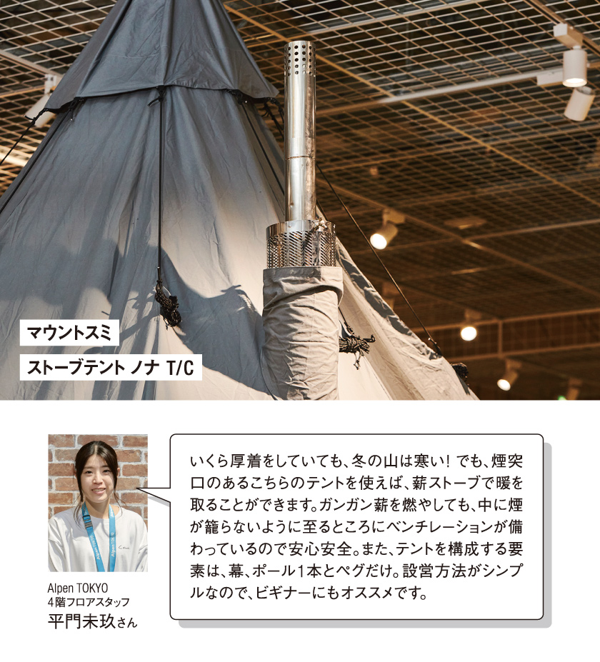 実際に商品を使って、「体感」できるのが「Alpen TOKYO」ならではの良いところ。そこで、全国津々浦々、地方店で経験を積み、満を持して旗艦店に召集されたアウトドア担当の精鋭、平門未玖さんに冬のキャンプサイトのコーディネートを依頼! おすすめアイテム6品は、スタイリッシュでいて機能的。洒落た気分で外遊びを満喫できる、初心者も玄人も満足の空間が出来上がりました。