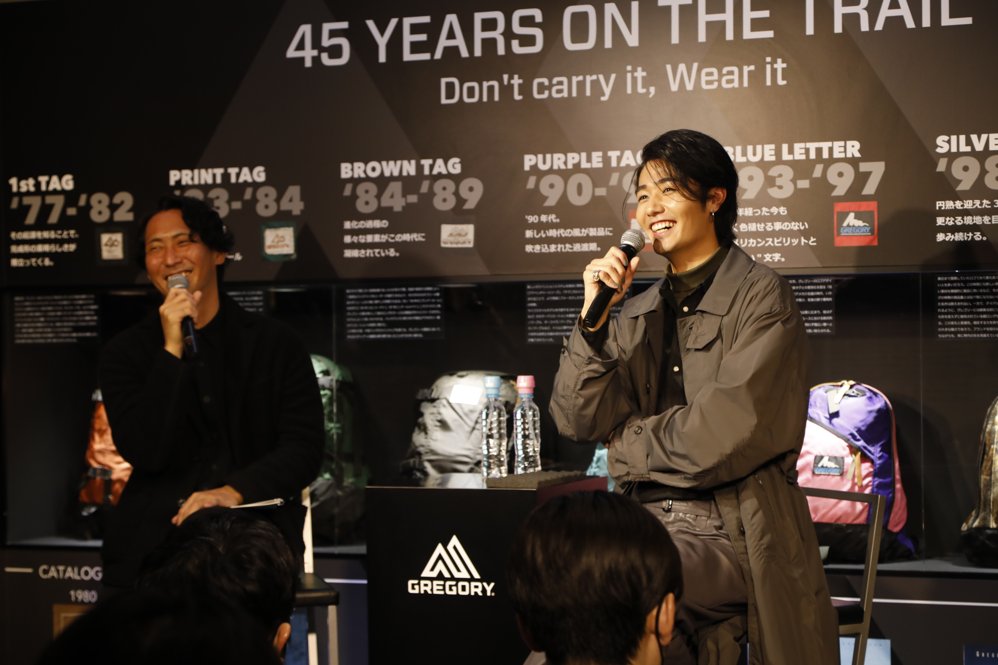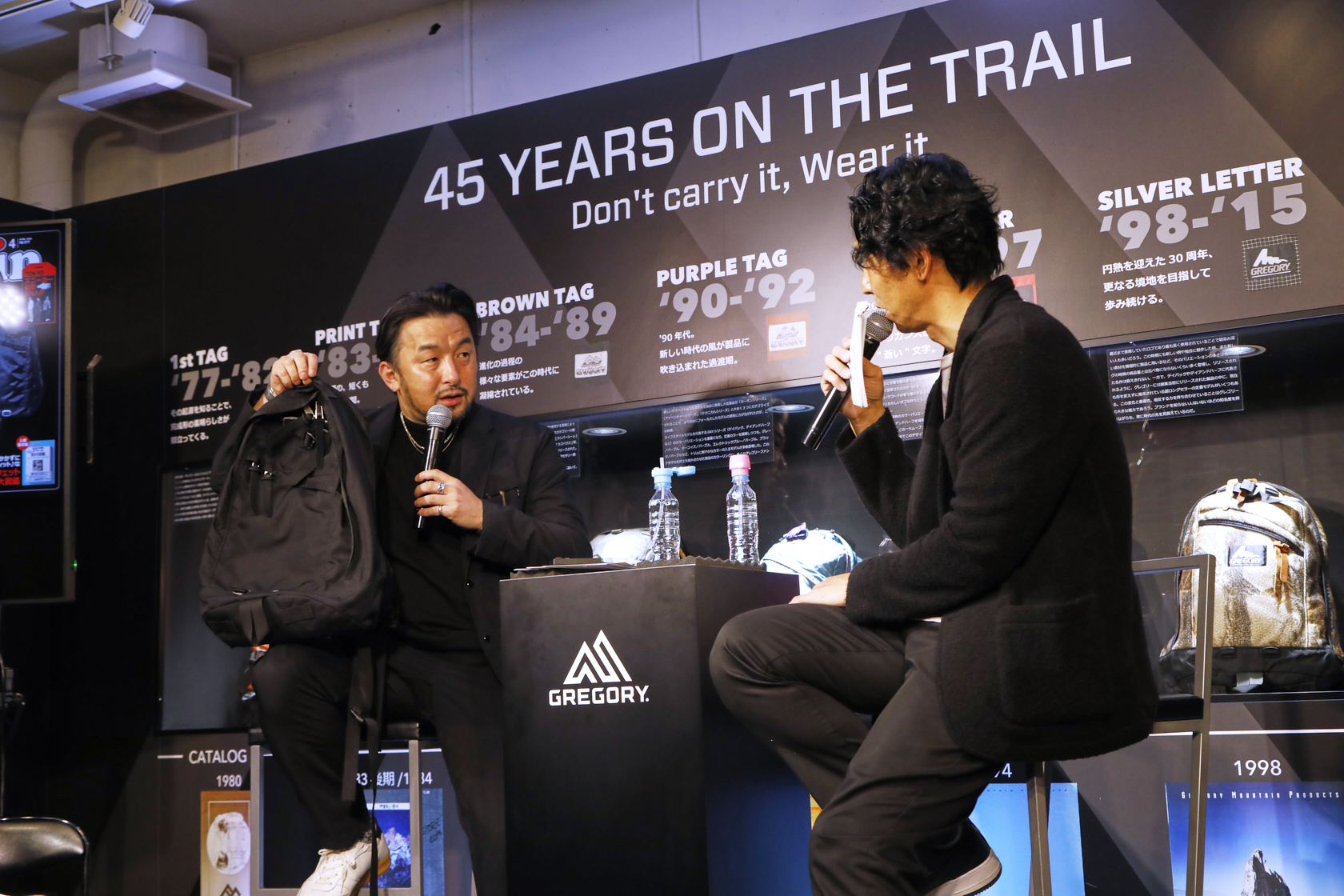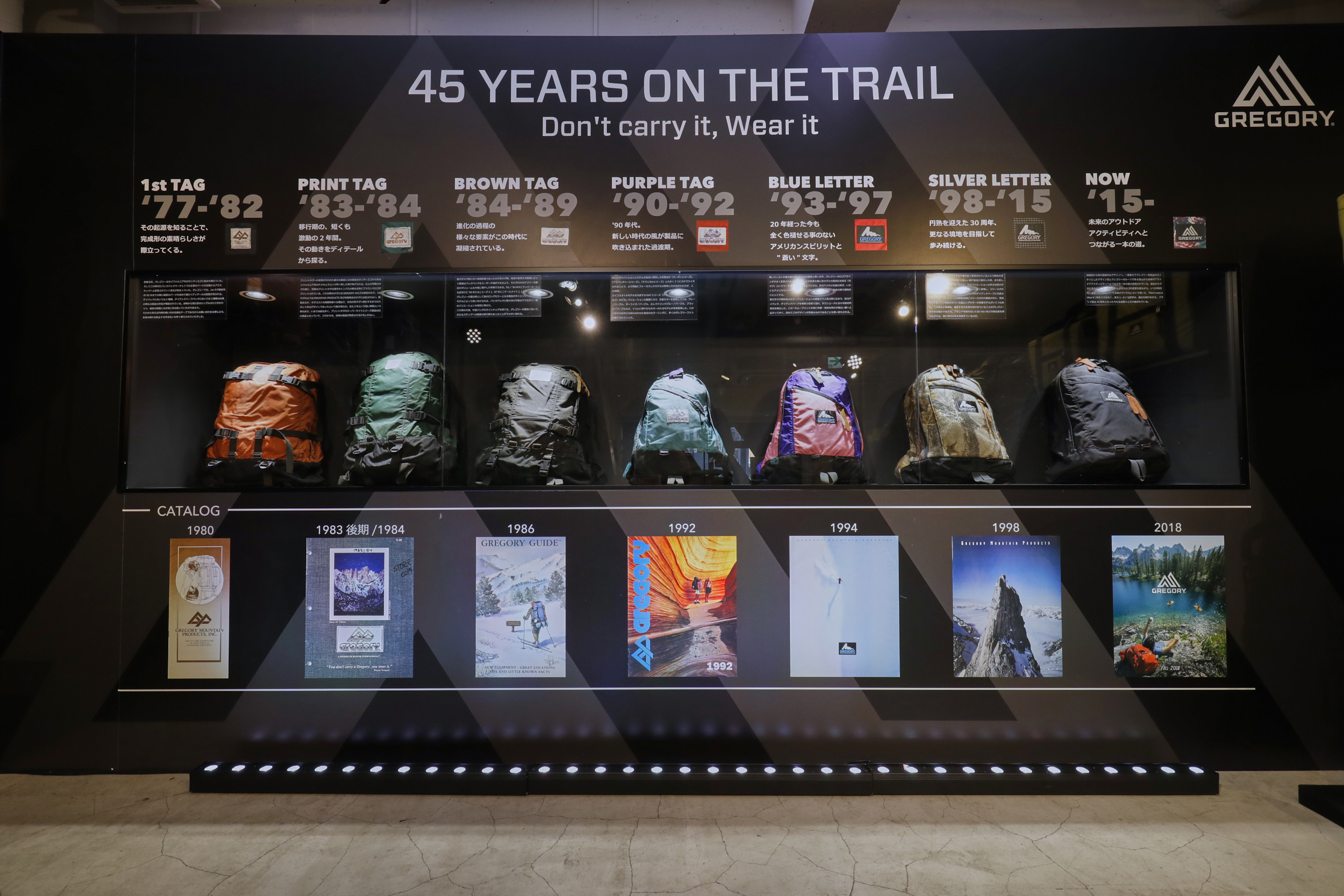 ファン垂涎のコンテンツとして、貴重なアーカイヴパックの数々とともにグレゴリー45年間の歴史を振り返るヒストリーウォールの展示も行われ、1977年のブランド設立から今日に至るまで、変化を重ねてきたロゴの変遷が解説されていました。