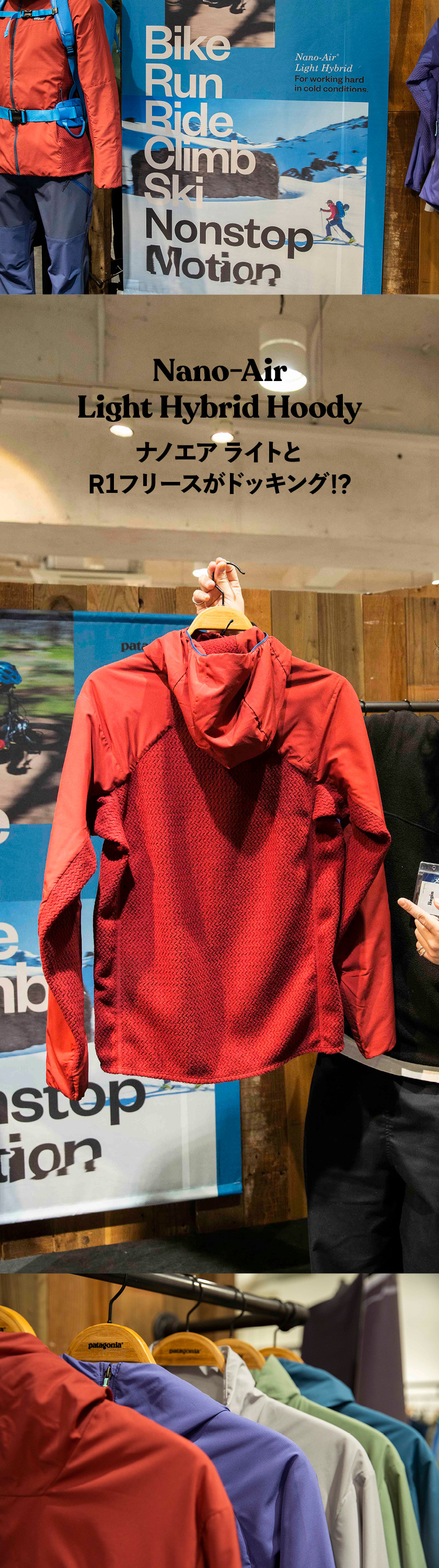 自社の異なるテクノロジー同士をハイブリッドさせる手法は、もはやパタゴニアのお家芸。今回はなんとナノエア ライト フーディーの背面全体に、R1 Airファブリックパネルを配置して、バックパックを背負った時でも、より蒸れずに快適〜♪を実現。軽くて暖かくて伸び〜るのは不変。これは激しめのアクティビティなんかでも頼りになりそう。