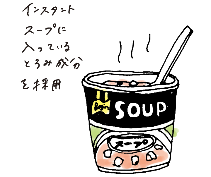 水と油の融合に、インスタントスープなどのとろみづけ用添加剤キサンタンガムが最適と判明。結果、水性、油性の両インクの長所を持つゲルインクのボールペンが誕生。