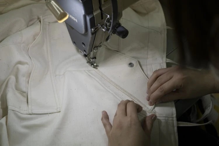 そのために、ポケットの生地は型紙よりも少し大きめにカットし、縫製のとき生地をふんわりさせながらボディに縫い合わせていきます。ポケットのタックの向きもランダムに入れられており、アイロンをかけてからミシンの上へ。