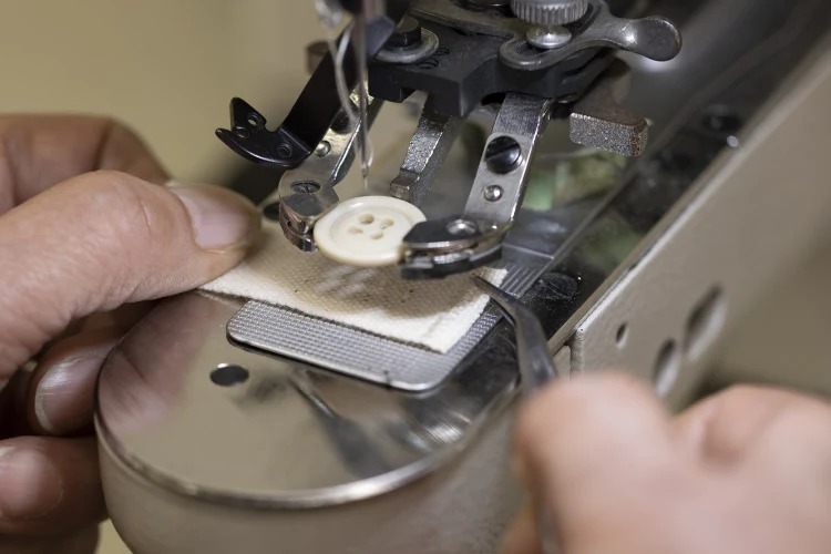 ボタンの種類はココナッツが原料のナットボタン。全て色味が異なり唯一無二の特別感を宿します。縫い付け方はボタンの表面に糸の×のできる“クロス付け”で、ボタン付け専用の特殊ミシンを駆使して行います。