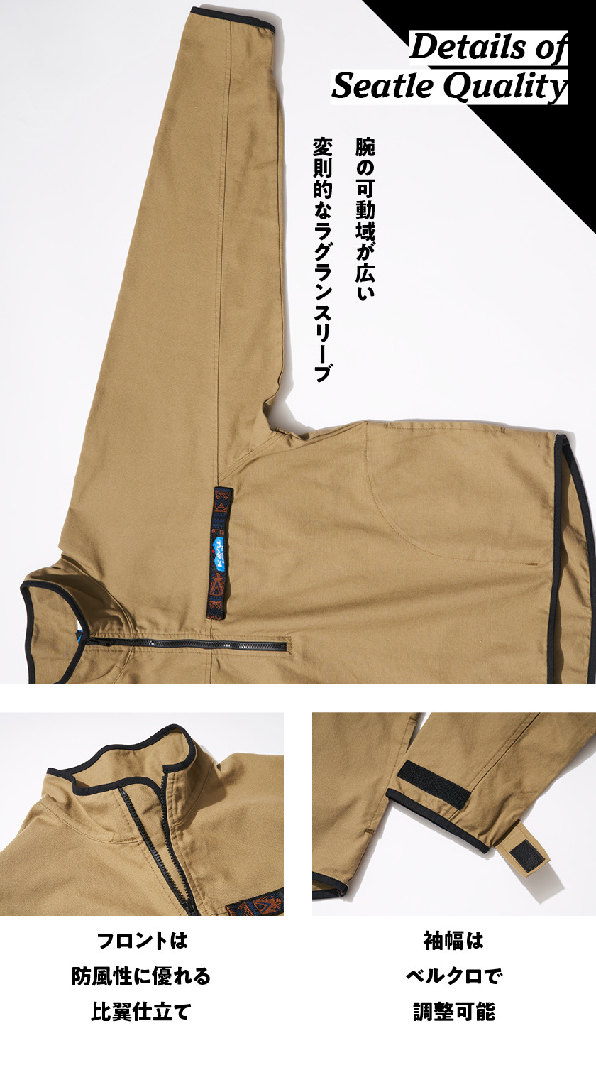 「スローシャツは漁の最中にボタンが網に引っかからないようにと考案した、ハーフジップタイプのシャツ。名前の由来はいたって簡単で、“ガバッと羽織れて、サッと脱ぎ捨てられる=スローできるから(笑)」。どれだけ激しく動いてもストレスを感じない変則ラグランや、強風を防ぐフロントの比翼仕立て、頑強な10オンスのコットンキャンバス生地などなど、海でのアクティビティにも耐えうるスペックを誇っていますが、レイヤードしやすく、定番物好きの間では洒落着としても浸透しています。