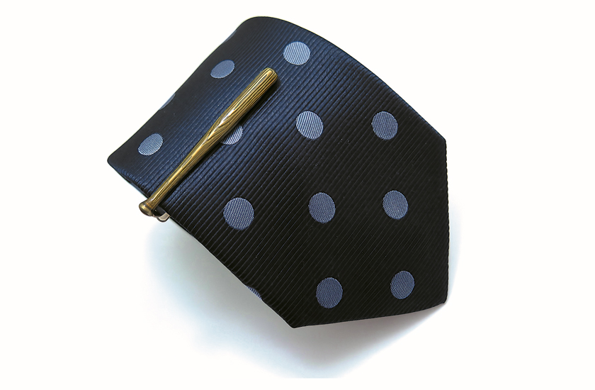 バット形のタイピンに水玉柄のネクタイ。ネクタイをよ~く見ると、一つだけ野球ボールになっていて、バットでボールを打っているように見えるんです。これで、ビジネスでもヒットを狙いましょう!ネクタイ W8×H142cm/タイバー 長さ6cm。8250円(WORLD CUFFLINKS)