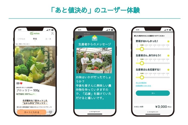 体験料金は、株式会社ネットプロテクションズの後払いサービス「あと値決め」を利用して支払います。ユニークなのは満足度に応じて自分で支払額を決められること。「美味しかった」「ありがとう」「応援したい」などの項目から直感的に値段を設定できます。この決済方法を取り入れた理由は、「オンラインでシャインマスカットと巨峰のセットを販売したのがきっかけ」と高橋さんは言います。