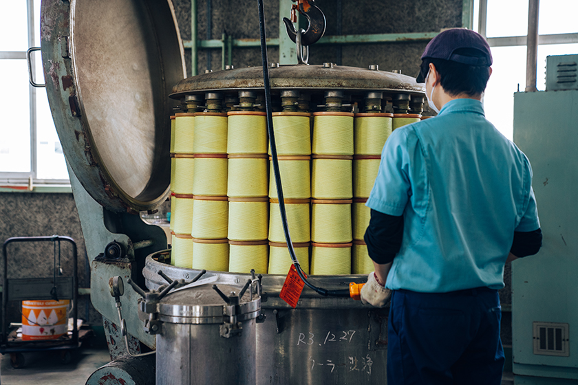 糸を染めてから生地に織り上げる先染め織物。こちらは糸を染める染色窯。天井から吊り下がったクレーンを使って糸を投入する。気温や湿度などで同じ染料でも微妙に色合いが変わることもあり、熟練の職人がタイミングを見極めながら染め上げる。