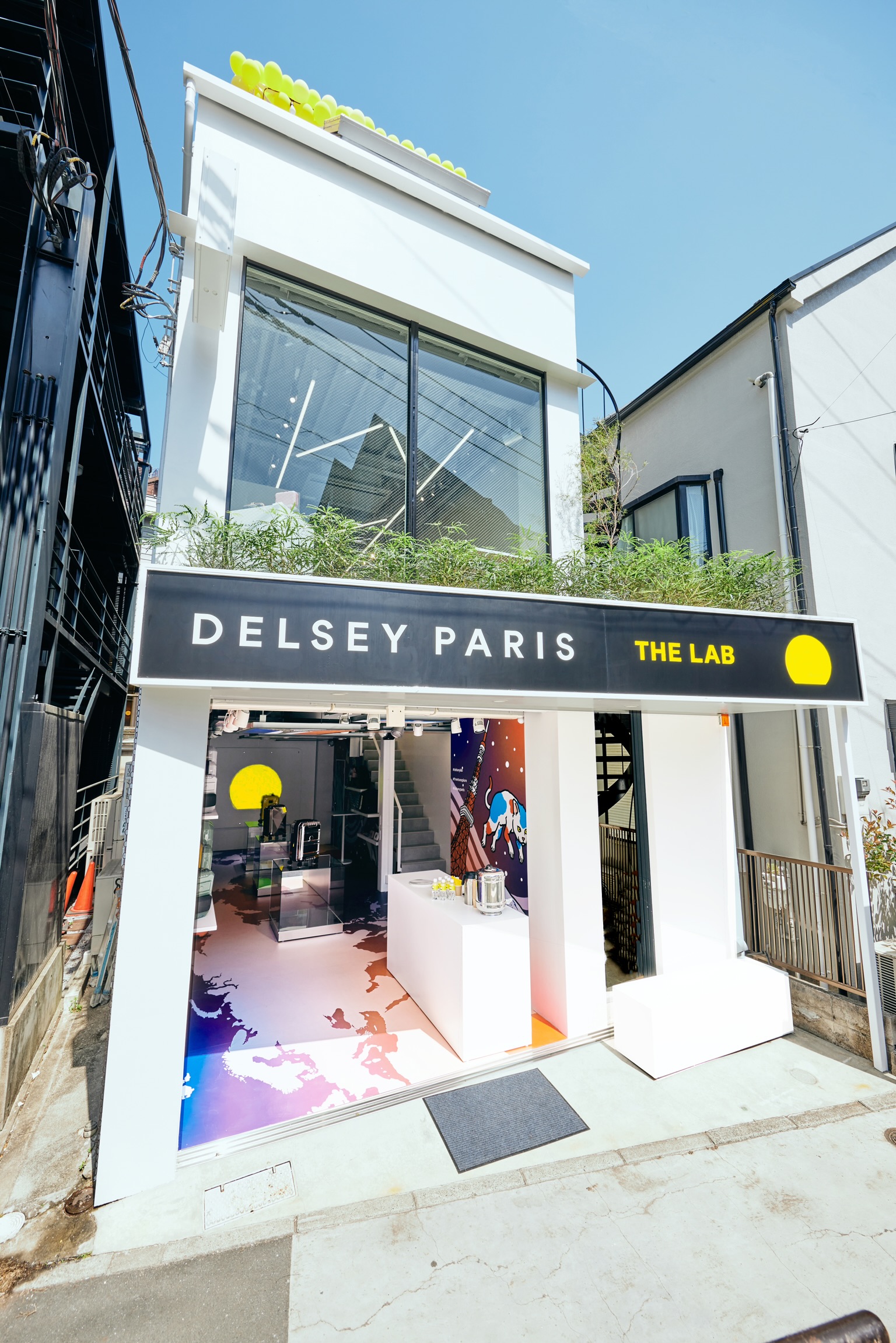 1階は、アーティストやコラボレーションアイテムを展開するためのギャラリー、2階には飛行機の壁を設置して、窓からはデジタルアートで創られたファンタジーの世界が広がります。両階のフロントには、デルセーのシンボル「ライジングサン」が大きくくり抜かれ、その中には時折キャットストリートにちなんで住む黒猫が現れます。店内のどの場所にいても、どこか遠く違う世界との繋がりを感じられるような、妄想をかき立てる店舗となっています。