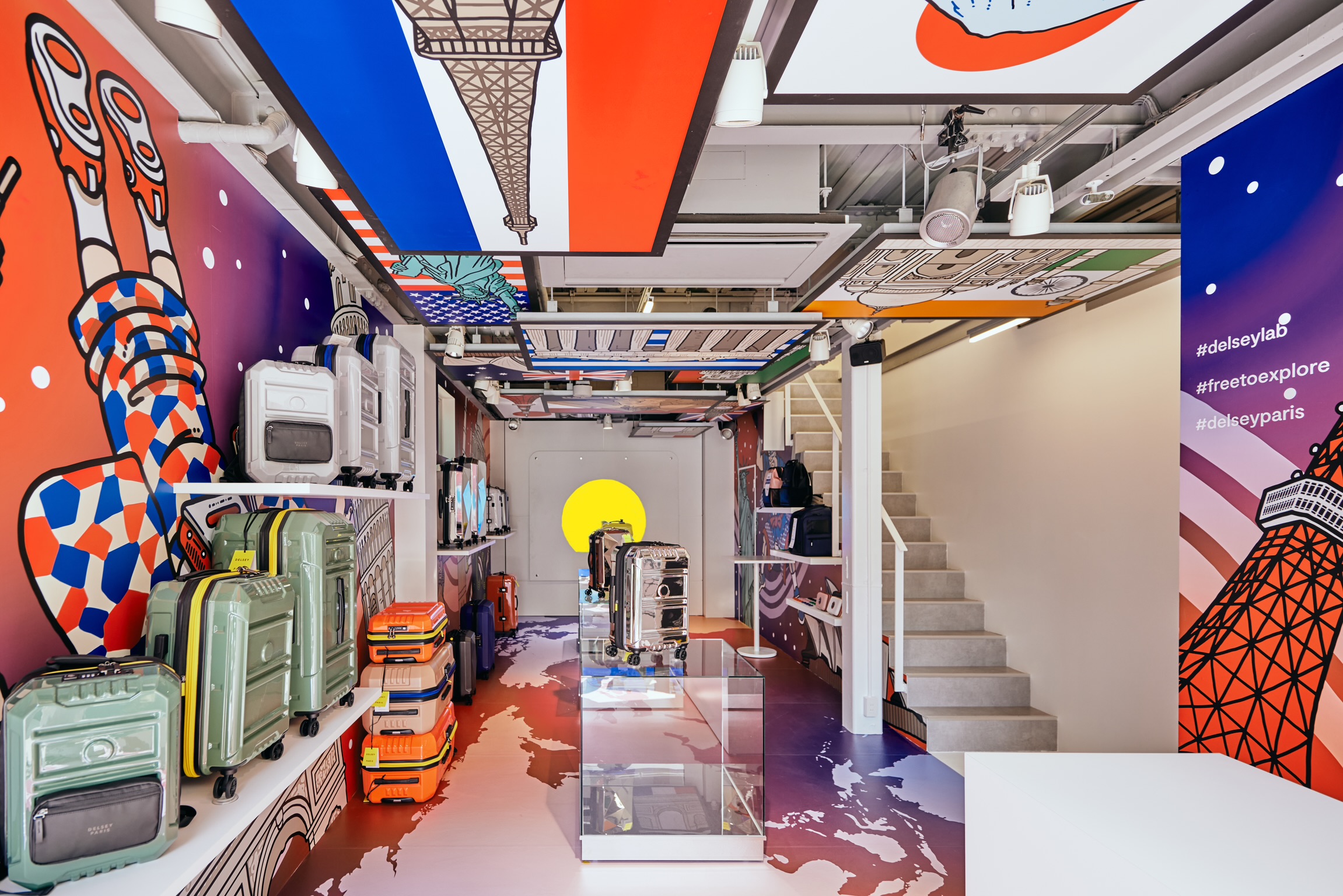 また、1Fは、日本のクリエイターがデルセーのために特別に手がけたデジタルインスタレーション作品やコンテンポラリーアート作品で彩られており、オープニングを飾るのは、「WA(和)」カルチャーとアメリカン・ポップカルチャーから着想を得たカラフルでダイナミックなイラストレーション作品を制作する日本のアーティストBEY。トリコロールを背景に、世界の名所とデルセーのデザインを散りばめた花札をダイナミックに描き、壁、床一面と、天上のパネルに取り込んでいます。