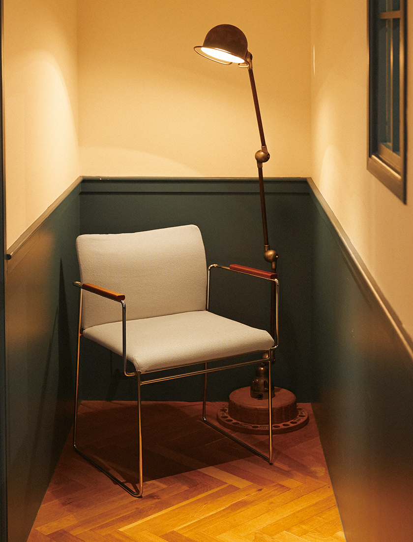 スチールパイプ同様、木製のアームレストもかなりナロー。面積こそ小さいが、その有機的な質感がこのデザインで担う役割は決して小さくない。当然、座り心地も快適だ。