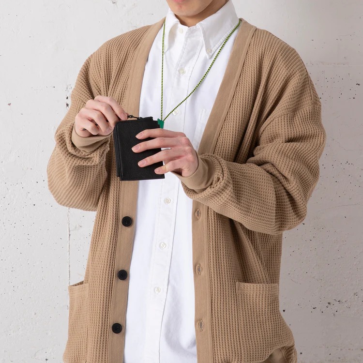 マルチウォレットもミニウォレットも、メインポケットの端っこにDリングを装備しています。手持ちのコードをくっつければネックウォレットとしても使えます。アクセ感覚で身につけて、ファッションのコク増しを狙うのもアリ!