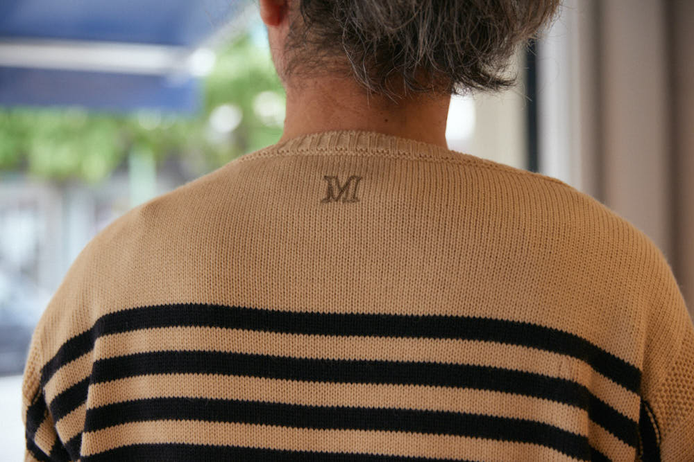 ベーシックで着回しやすいのに、他のニットにはない通好みな意匠を備え、多くのブランドからベンチマークされているイギリスのガンジー島発のニットがベース。ここに群馬・桐生の伝統技法、ハンドルミシンを使ったチェーン刺繍を入れました。首元にMを、裾口にLをそれぞれ一か所入れています。Mを見せたい時は表面に、ベーシックなガンジーセーターとして楽しみたいときは裏面で着る事ができます。