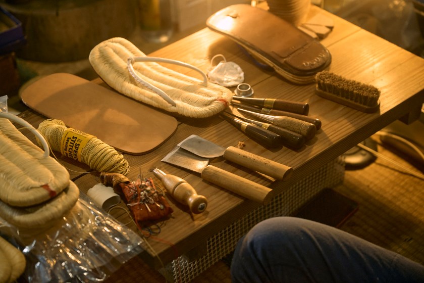 下駄や雪駄を分解して、ある程度の構造は自力で理解していた壽ん三さん。鼻緒すげ(本体に鼻緒を取り付ける作業)も習得していましたが、どうしても素人の荒い手仕事になってしまうため、正しい道具選びや細かいディテールの仕上げ方を職人に教えてもらう必要がありました。