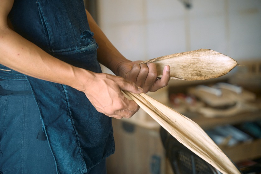 「九州まで行って、実際にタケノコの皮を取ってきました。本当はコレを使ってオモテを自作したいんですが、売り物として販売できるまで技術が身についていない。喧嘩雪駄は山形県の職人さんが手作りしてくれているオモテを使っていますが、オモテを卸してくれるところを見つけるだけでも大変だったんですよ」