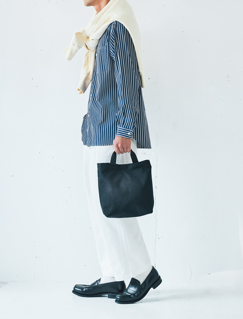 ヨロズの鞄上記参照。ユナイテッドアローズのシャツ1万9800円(ユナイテッドアローズ 原宿本店) コノロジカのパンツ2万8600円(HEMT PR) 肩に掛けたゴートのスウェット7920円(ヤギ) パラブーツの靴9万9000円(パラブーツ 青山店)