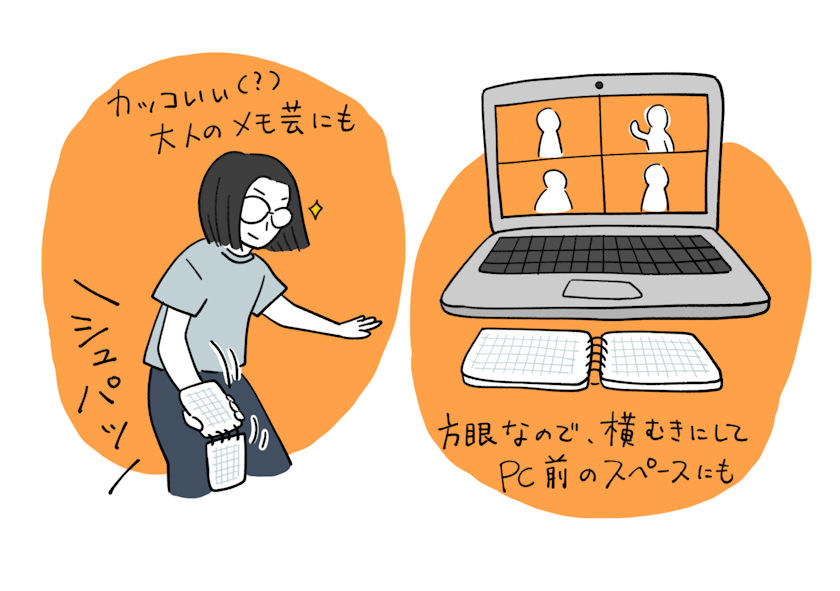 カッコいい大人にあこがれつつも、お酒も飲めず、タバコも吸わない私は、「リングメモ パッと」をカッコよく開く練習を夜な夜な積み重ねて、あこがれに少しでも近づきたいと思う。そもそも、カッコいい大人がメモ帳をカッコよく開く練習をするものなのか?という点については、今は考えないようにしたい。