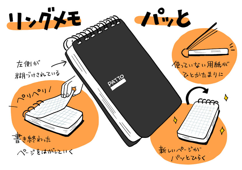 というわけで今回紹介するアイテムは、飲んだところまでならぬ、書いたところまででページをキープしてくれて、次に開くときに新しいページをパッと出してくれるバーのマスターのようなメモ帳、ミドリの「リングメモ パッと」である。「メモパッド」ではなく、「メモ パッと」なので、お間違いなきよう。