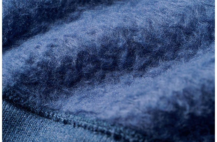 一般的な裏起毛はループ状のスウェットを引っ掻くことで作られていますが、それだとループが破壊され、着た時の保温力はかなり下がります。 このスウェットは、生地の段階から起毛を生む特殊な製法によって、ループ部分と起毛部分、2層の保温効果を持たせています。 暖かさ、段違いです!