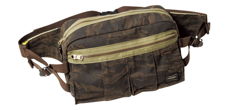 コットンダック地の粗野感を残したままタイガーカモを表現するために、プリントではなく顔料コーティング! ……というと凄さがわかりにくいが、要は版画と同じ要領で何度も重ねてコーティングしている超力作なのだ。W28.5×H17×D14.5cm。1万7500円。(吉田)