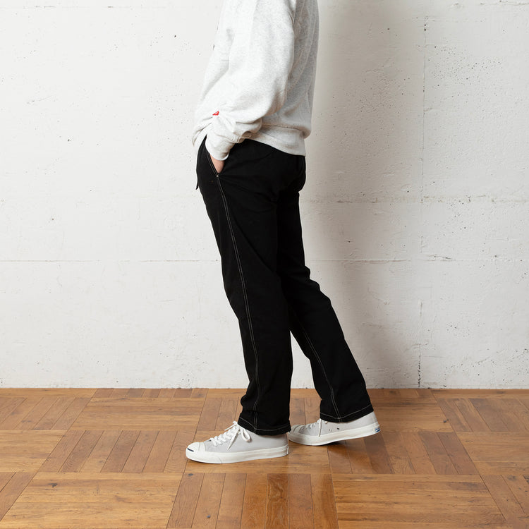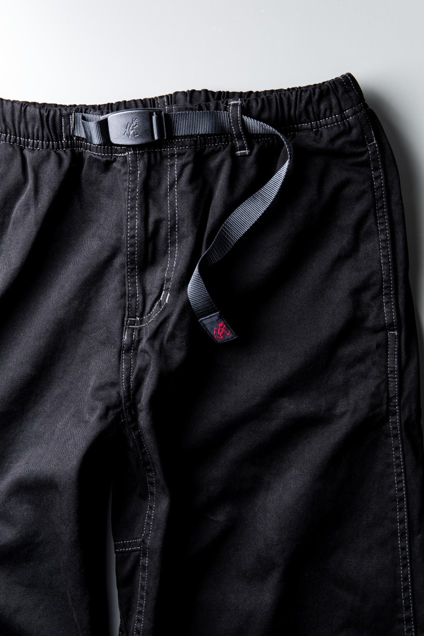天然素材のコットン部分は黒に染まり、化学繊維のステッチやボタンは元の色のまま。染まりきらないステッチがワークパンツ風味なアクセント。黒染めで加工しているとはいえサイジングは変わらないので、グラミチならではの美シルエットは健在です。程よいゆとりのあるシルエットで、裾口はドローコードで絞れる調節可能な仕様も◎。
