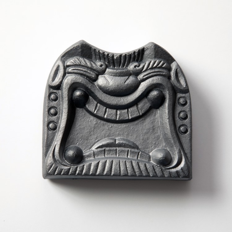 鬼瓦は、粘土を成形し、乾燥後に1100℃以上で焼成したいわゆる“陶器”。焼成の最終工程で燻化を行い、素地表面に炭素被膜が作られることにより銀色に発色します。この色が俗にいう“いぶし銀”。釉薬を用いないため、革製品のように徐々に味わい深い色へと経年変化するんですね。