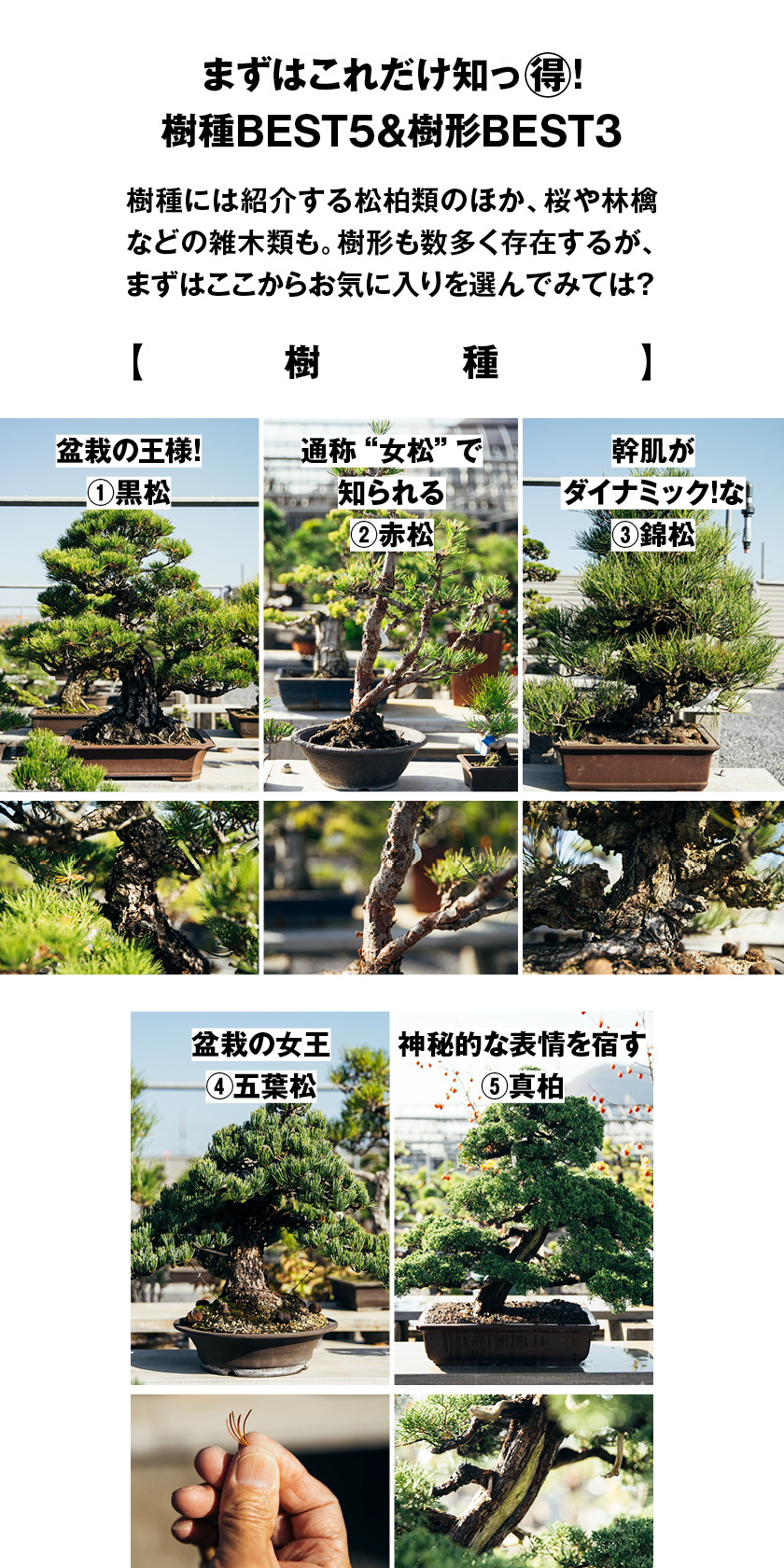 ①幹肌が黒く男らしい佇まいが魅力の黒松は、盆栽界の永世定番!