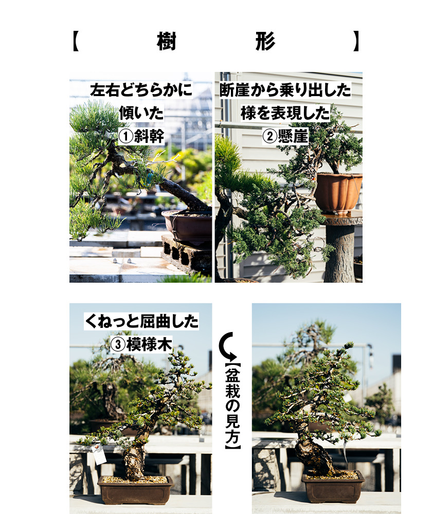 ②鉢の底より下に頭が垂れ下がった懸崖は、厳しい自然環境を感じさせる樹形。