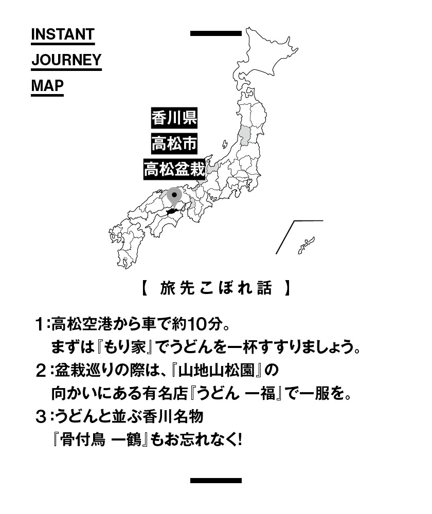 本来、香川旅の目的はうどん!かもしれないが今回の本題は盆栽。じつは香川県高松市は、松盆栽日本一の生産地(国内で売られている松盆栽の8割!)なのだ。始まりは200年以上前の江戸時代。全国からこんぴらさんにお参りに訪れる人たちへ野山に生えた木を器に植えかえてプレゼントしたことが始まりといわれている。また、香川県は寒暖差や降水量が少なく、水はけのよい土壌が松の生産に適していたことや、元来果樹の生産で培われてきた接ぎ木のノウハウを盆栽に転用できたことも大きいとされている。