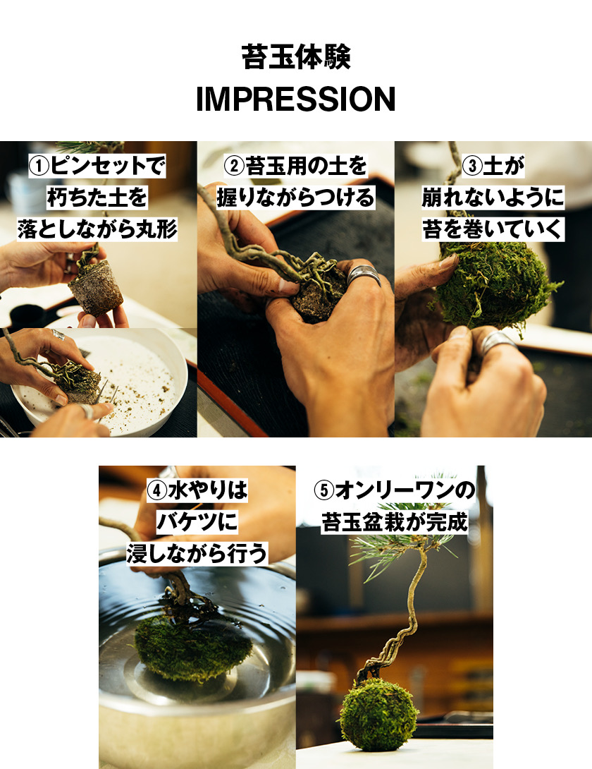 「苔玉は、手軽で可愛らしいという理由で園芸店が始めたもので、20年くらい前に父が盆栽に取り入れるようになりました。根がパンパンに張り巡らされた状態になった盆栽は、鉢から取り出しても土が崩れないので、そのままでも育つ。盆栽界では、これを“根洗い”というんですが、それを苔で巻いたものが苔玉盆栽というわけです。体験は、まずお気に入りのベースを選ぶところからスタートします。予め私が300くらいあるなかから、ある程度チョイスしていますが、もっと見たい方は田んぼへ探しにいっていただいてもOKですよ」。