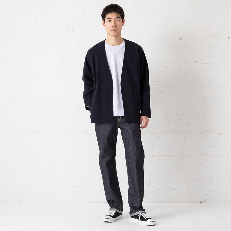 ナイロンにポリウレタンを混紡したナイロンジャージー素材のカーディガンを色別注。ノーカラーの程よいリラックス感は、現代のビジカジスタイルにぴったりマッチし、さらにオフで羽織ってもちょうど良い上品さを演出してくれます。