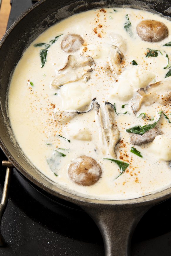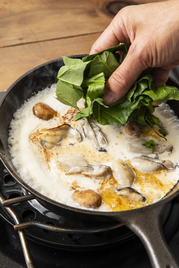 なんたって牡蠣とマッシュルームをバターの海で泳がせるように焼いてから、生クリームとチーズを加え、サッと煮るだけで一丁上がりなんですから。具材の旨味がきいているので味付けは不要。牡蠣とマッシュルームはこんがり焼きつけると、食欲をそそる見た目と香ばしさに仕上がりますよ。