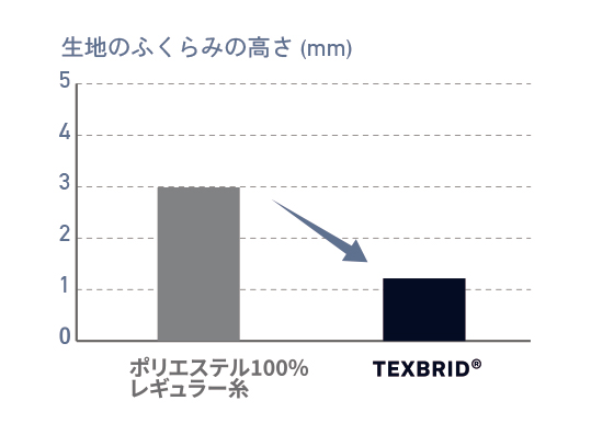 原料はポリエステルなのですが、ポリエステルにも違いがあって、テックスブリッドは、加熱することで縮む分子と一般的なそれを組み合わせた糸構造により、バネのように伸びやすく縮む性質を獲得。通常のポリエステル糸の4倍近くも伸び、かつ回復性にも優れるというのだから驚くほかありません。