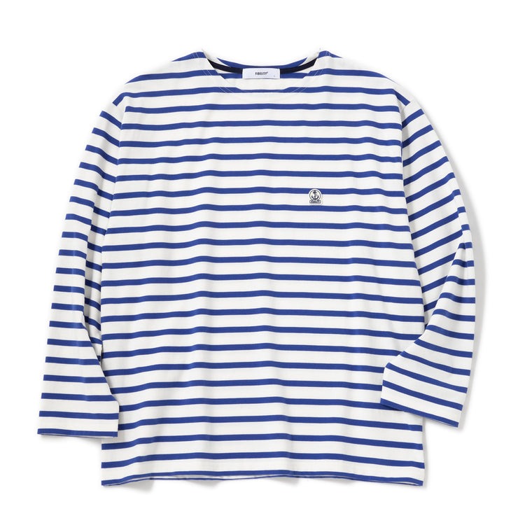 ブランドの新定番ボーダーバスクシャツ。首元の開きすぎない浅めのボートネックで、クセがなく落ち着いた雰囲気で着られます。程よくゆるい身幅で、ユニセックスにも対応するサイズ感も使い勝手抜群! コットン100%でしっかりとした肉厚生地を採用し、胸の錨マークのワッペンがポイントになっています。