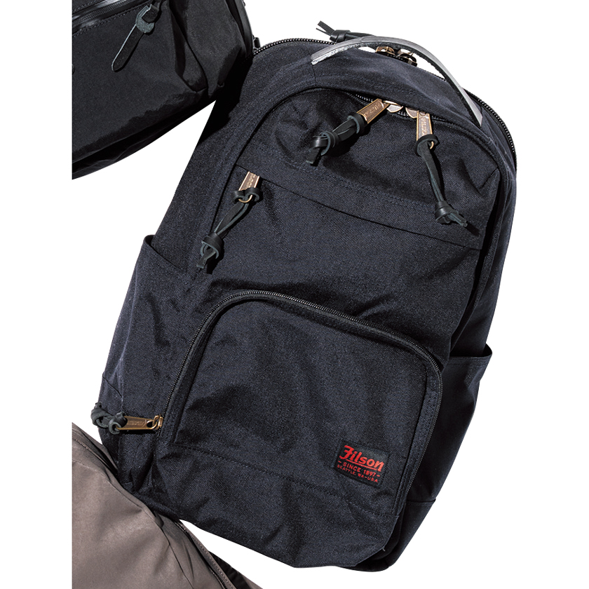 耐久性と耐候性を高めた1000デニールのコーデュラナイロンで頑強さは言わずもがな。真鍮製ジップとブライドルレザーのパーツがさらなる無骨さを後押しする。W32×H45×17cm。5万5000円(フィルソン)
