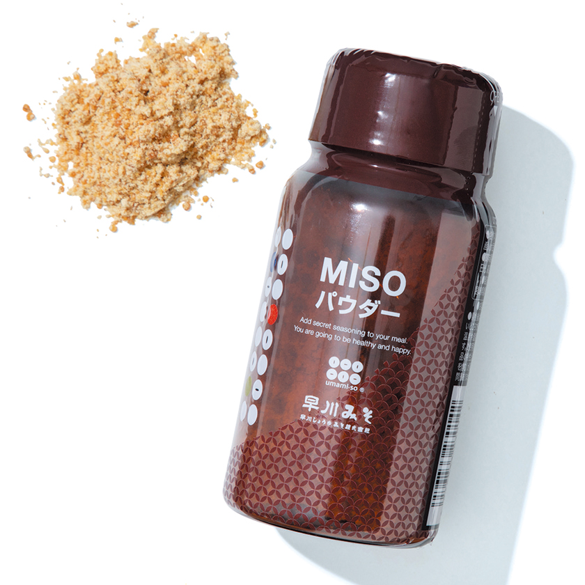 九州産大麦、大豆のみ使用。独自の粉末製法により、味噌特有の風味をそのままに味わうことができる。パルメザンチーズのように香ばしく、海外からはヴィーガンチーズと好評。発酵により発生するGABAは交感神経の亢進を抑えると言われ、リラックス効果も期待。632円(早川しょうゆみそ)