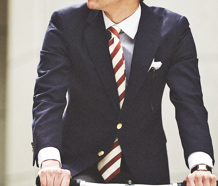 ブレザートレンドの波に乗って再び注目されるレジメンタルタイも、トラッドの趣が色濃いアイテム。