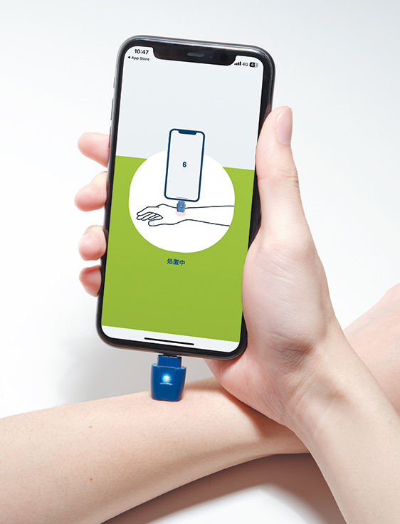 必要なのはスマホと専用アプリのみ。ヒートイットを挿し、アプリ内で年齢や肌タイプ設定したら、あとは促されるまま虫刺され部に当てるだけ。max10秒。かゆみの元であるヒスタミンの分泌が抑えられ、悩みを解放。