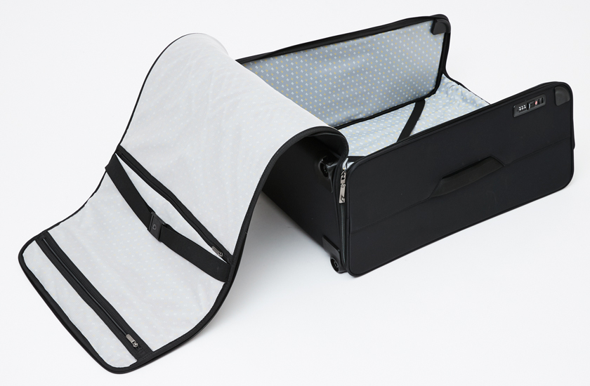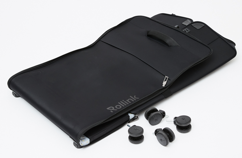 まずは、上の写真をご覧ください。一見、衣類がかかっているクロゼットですが、じつは真ん中のガーメントケースらしき黒い物体、これがトロリー。折り畳まれた板を展開、端をファスナーで留め、キャスターを取り付けたらホラ、トロリーに。