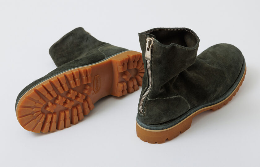 また、グイディのシグネチャーモデルのショートバックジップブーツも別注。アッパーに使用されたオリーブ色とビブラムソールのはちみつ色の相性は周知の通り。適度な色味で着こなしにアクセントを加えてくれる優秀な一足です。