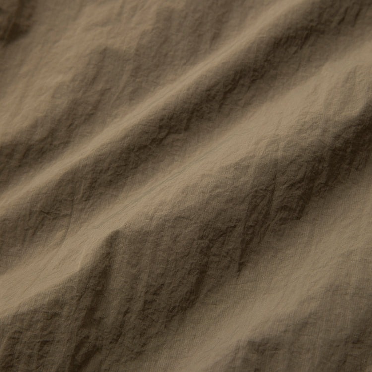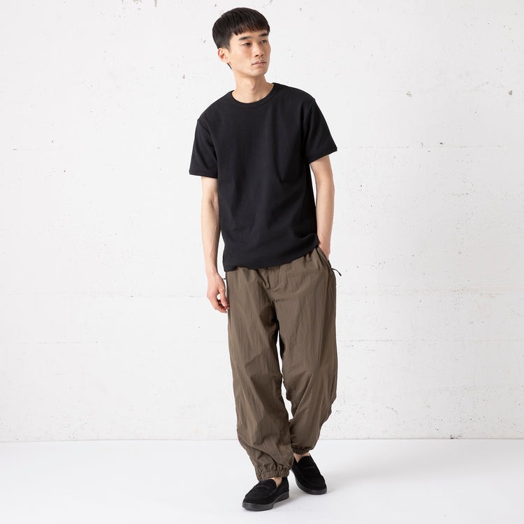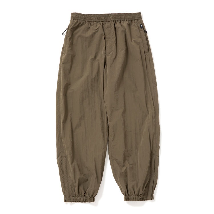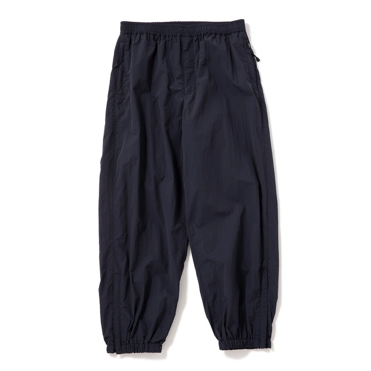 フライトパンツにインスパイアされた、ハリのあるナイロンパンツ。撥水加工を施しているため、多少の雨降りもなんのその。ライナーにメッシュを使用し、ムレ対策も万全。ジップ使いやポケットの縫製、裾のリブなど、軍モノらしいディテールを採用。ウエストにゴム入りで、穿き心地楽チンです。