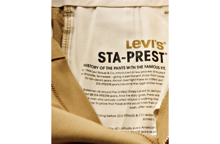 洗濯してもクリースが消えない、という謳い文句で1964年に開発された“STA-PREST(ステイ・プレスト)”。アイロン要らずの美脚パンツはアイビーリーガーの間で大ヒットした。ちなみにスタプレは日本での愛称。