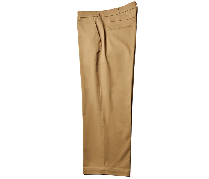 その伝説的パンツの持ち味である、消えないクリースを踏襲しながらワイド化したパンツは、“伝統”と“旬”が矛盾なく同居。ワイドなのに品よく見えるうえ、通好みなバックボーンまであるから、ビギナーでも臆せず穿きこなせちゃいますよ。